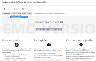 Excellent service de transfert de fichier 'assez' lourd (maximum 500 Mo), gratuit et libre: Framadrop. Il suffit de faire glisser votre fichier sur le cadre prévu à cet effet, pour récupérer le lien de partage, que vous pouvez ensuite envoyer à vos contacts. Les fichiers sont ensuite cryptés sur le serveur. Plus le fichier est lourd et moins le serveur le stockera longtemps: max 500Mo/24h, max 200Mo/7 jours, max 50 Mo/30 j et max 2Mo/60jours.
